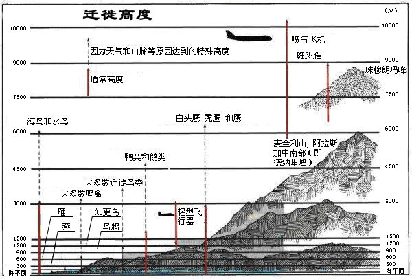 鳥類遷徙時的飛行高度一般不超過1000米。小型鳴禽的飛行高度一般不超過300米,大型鳥類有些可達3000~6300米,有些大型種類(如天鵝)能飛越珠穆郎瑪峰,飛行高度達9000米。鳥類夜間遷徙的高度常低于白天。候鳥遷徙的高度也與天氣有關。天晴時鳥飛行較高;在有云霧或強逆風時,則降至低空。