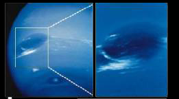 人們用望遠(yuǎn)鏡觀測海王星,看到它是個藍(lán)綠色的圓球狀天體,較高的反射率,表明它有濃密的大氣層。大氣的主要成分有甲烷和氫。海王星的大氣云層在高速流動,風(fēng)暴接連不斷。在大氣層中有一些亮斑和暗斑,還有一些類似于木星大紅斑的“大黑斑”。大黑斑是逆時針方向運動的氣團(tuán)。大黑斑的南部還伴有明亮的白斑。