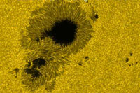 太陽黑子,也叫日斑。它發(fā)生在太陽的光球?qū)由,是太陽中最基本、最明顯的活動現(xiàn)象。一般認(rèn)為,太陽黑子實際上是太陽表面一種熾熱氣體的巨大漩渦,溫度大約為4500K。因為比太陽的光球?qū)颖砻鏈囟纫,所以看上去像一些深暗色的斑點。太陽黑子很少單獨活動,常常成群出現(xiàn)。