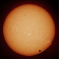 當(dāng)金星運行到太陽和地球之間時,我們在太陽圓面上會看到一個小黑點穿過,這種現(xiàn)象稱為金星凌日。黑色小圓點就是金星的投影。通常都是用小時來計算金星凌日的時間(2004年和2012年,持續(xù)大概6小時)。金星凌日以兩次凌日為一組,間隔8年,但是兩組之間的間隔卻有100多年。2004年之前的最后組金星凌日發(fā)生在1874年的12月和1882年12月。21世紀(jì)的首次金星凌日發(fā)生在2004年6月8日,這一組的另一次將要發(fā)生在2012年的6月。再下一次是2117年和2125年。