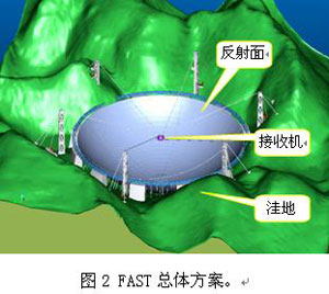 備注:500米口徑球面射電天文望遠鏡(Five-hundred-meter Aperture Spherical Radio Telescope,縮寫為FAST)利用貴州天然的喀斯特洼坑作為臺址,洼坑內鋪設數(shù)千塊單元組成500米球冠狀主動反射面,球冠張角110-120度,通過主動控制在觀測方向形成300米口徑瞬時拋物面;采用輕型索拖動機構和并聯(lián)機器人,實現(xiàn)望遠鏡接收機的高精度定位。工作波段范圍從4.2米到10厘米,將在中性氫巡查、脈沖星觀測、和星際通訊信號的搜尋方面發(fā)揮強有力的作用。