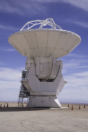 備注:阿塔卡瑪毫米波大天線陣(Atacama Large Millimeter/submillimeter Array,縮寫為ALMA),座落在智利阿塔卡瑪海拔5000米高的查南托高原上。ALMA由66面高分辨率天線組成,包括主陣列上的50個12米天線,以及另外兩陣列上的4個12米天線和12個7米天線。ALMA觀測波長從9.6毫米到0.3毫米,最長基線可達16千米,這使ALMA有非常好的空間分辨率,將是哈勃空間望遠鏡的10倍,所成圖像的清晰度可與VLT干涉陣相媲美。
