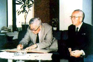六月三日華羅庚到達日本后,受到日本朋友的盛情款待,心情很愉快。他在訪問中,一直考慮和準備要作的報告。 十二日下午一點半,他離開旅館,2時與日本學時院會見日本數(shù)學界的院士們。 華羅庚將剛出版的《華羅庚科普著作》送給各位院士。院士們也將他們自己的著作送給華羅庚。 |