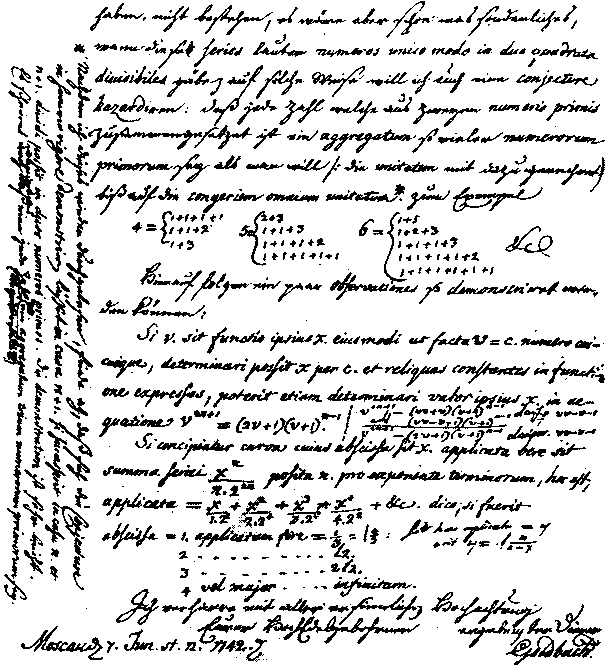 1742年哥德巴赫發(fā)現(xiàn)這樣一個(gè)事實(shí):6=3+3,12=5+7,18=11+7,……等,于是他在1742年6月7日寫信給當(dāng)時(shí)住在俄國彼得堡的大數(shù)學(xué)家歐拉。哥德巴赫在信中說:”我的問題是這樣的:隨便取某一個(gè)奇數(shù),比如77,可以把它寫成三個(gè)素?cái)?shù)之和:77=53+17+7;再任取一個(gè)奇數(shù),比如461,461=449+7+5,也是三個(gè)素?cái)?shù)之和,461還可以寫成257+199+5,仍然是三個(gè)素?cái)?shù)之和。我發(fā)現(xiàn):這樣任何大于5的奇數(shù)都是三個(gè)素?cái)?shù)之和。但這怎樣證明呢?雖然做過的每一次試驗(yàn)都得到了上述結(jié)果,但是不可能把所有的奇數(shù)都拿來檢驗(yàn),需要的是一般的證明,而不是個(gè)別的檢驗(yàn)!