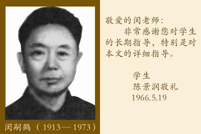 1966年《科學通報》第17卷第9期上發(fā)表了陳景潤的著名論文《大偶數(shù)表為一個素數(shù)及 一個不超過兩個素數(shù)乘積之和》即哥德巴赫猜想(1+2)的簡報,陳景潤一拿到這期《科 學通報》,首先想到的是他的閔嗣鶴老師,他在送給閔老師的一份該期《科學通報》雜志 的封面上端端正正地寫上了:“敬愛的閔老師;非常感謝您對生的長期指導,特別是對本文的詳細指導。生景潤敬禮。