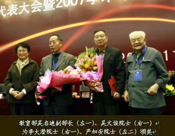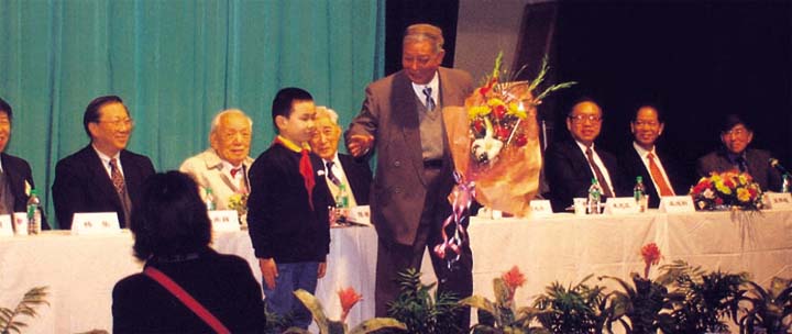 中國數(shù)學(xué)會(huì)常務(wù)理事會(huì)決定組成評獎(jiǎng)委員會(huì),其成員為本會(huì)正副理事長、秘書長和個(gè)別專家組成,他們都是知名數(shù)學(xué)家。評獎(jiǎng)委員會(huì)隨中國數(shù)學(xué)會(huì)理事會(huì)換屆而換屆(四年一屆)。 “華羅庚數(shù)學(xué)獎(jiǎng)”自1992年開始設(shè)立以來,已連續(xù)舉辦了五屆,每屆2人,每人獎(jiǎng)金為2.5萬元人民幣。每屆評獎(jiǎng)后都召開隆重的頒獎(jiǎng)大會(huì),并邀請國家領(lǐng)導(dǎo)人(如全國人大常委會(huì)副委員長周光召、丁石孫等)出席大會(huì)并為獲獎(jiǎng)?wù)哳C獎(jiǎng)。同時(shí)通過新聞媒體進(jìn)行宣傳報(bào)導(dǎo),使“華羅庚數(shù)學(xué)獎(jiǎng)”在海內(nèi)外數(shù)學(xué)界的影響越來越大! 下圖為2000年中國科學(xué)院數(shù)學(xué)與系統(tǒng)科學(xué)研究院應(yīng)用數(shù)學(xué)研究所的丁夏畦院士獲得第四屆華羅庚數(shù)學(xué)獎(jiǎng),少年隊(duì)員向丁教授獻(xiàn)花。 |