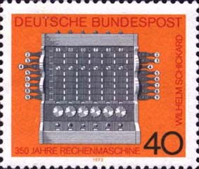 德國(guó)1973年6月12日發(fā)行了為紀(jì)念由Tubingen大學(xué)Wilhelm Schickard教授建造計(jì)算機(jī)350周年的郵票。 |