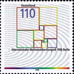 德國(guó)為紀(jì)念1998年國(guó)際數(shù)學(xué)家大會(huì)在柏林召開而柏林設(shè)計(jì)的郵票。這是“矩形求方”問(wèn)題的一種解法,該問(wèn)題是要把整數(shù)邊的矩形分成具有整數(shù)邊的大小不等的正方形。 |