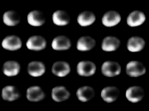 1994年11月28日至12月1日哈勃望遠(yuǎn)鏡拍攝的第4號(hào)小行星---灶神星系列照片,顯示了全部5.34小時(shí)的自轉(zhuǎn) |