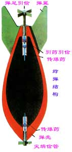 它的主要組成部有:彈體、炸藥、引信、穩(wěn)定翼和懸掛裝置。彈體又叫彈殼,它可將部件連成一體,又可將炸藥裝在里面。炸藥點著后,迅速燃燒而產(chǎn)生大量氣體和極大壓力將彈體爆炸成許多碎片,用碎片和爆炸氣浪來殺傷敵方兵員和摧毀軍事設(shè)施。引信是發(fā)火裝置,又叫信管,可用來引起炸藥爆炸。它可分觸發(fā)的、延期的和定時的三種。觸發(fā)引信當(dāng)炸彈頭一碰目標(biāo)的就立即引火爆炸,延期引信要過幾秒或幾十秒才爆炸,定時引信是等炸彈落到目標(biāo)后,過一定時間、從幾分鐘到幾十小時才引起爆炸。穩(wěn)定翼多裝在彈尾,可用來保證炸彈穩(wěn)定地下落,準(zhǔn)確地?fù)糁心繕?biāo)。至于懸掛裝置則是球把炸彈懸掛在飛機(jī)的炸彈架上的。