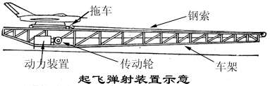 起飛彈射裝置就是一個獨立的起飛跑道,由拖車、車架、鋼索和動力裝置等組成。起飛時,飛機安放在拖車上,并點燃發(fā)動機。然后車架上的動力裝置開始工作,通過傳動鼓輪和鋼索牽引拖車,來加大飛機的起飛推力,使飛機很快地加速到離地速度,脫離拖車而起飛。拖車靠車架上的減速裝置而停止前進。