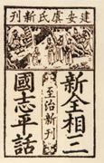 在書籍裝飾方面,變化比較大的當(dāng)屬帶圖封面(又稱書名頁(yè))的出現(xiàn)和創(chuàng)新。元朝以前的書籍都沒有封面,更沒有帶圖的封面出現(xiàn)。 最早出現(xiàn)的書名頁(yè),當(dāng)屬元至元三十一年(1294年)建安書堂刻印的《新全相三國(guó)志□□》,書名后二字殘缺,有人認(rèn)為其應(yīng)為“故事”二字。但有人直書“平話”二字。