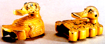 陜西寶雞益門村出土。春秋后期。呈水禽引頸回首凝望狀。左器造型較為寫實(shí),喙扁長(zhǎng)如鴨喙,頭飾綠松石,胸有龍紋,背飾羽,兩側(cè)翅、爪、尾呈扇形張開,腹內(nèi)置一柱狀勾。右器禽頭呈球狀,喙上飾一對(duì)“S”形紋。背飾龍紋,有十四個(gè)孔,當(dāng)為鑲嵌飾品所留。腹中為柱狀勾鈕,底部有孔。