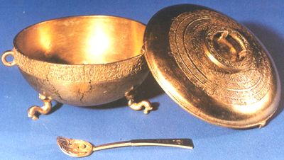 湖北隨縣擂鼓墩出土。戰(zhàn)國(guó)早期。盛食器。蓋頂有四柱支撐的環(huán)形提鈕,蓋沿有三個(gè)等距的銜扣。平口,口沿外側(cè)有對(duì)稱(chēng)環(huán)耳,三足作向外彎曲的倒置鳳首。提鈕面飾渦云紋,蓋面飾蟠螭紋、绹紋、勾連雷紋四周,口沿下飾蟠螭紋一周。鼎內(nèi)有一鏤空金匕,淺圓窩形,扁柄,鏤空渦云紋。金鼎器形別致,莊重美觀(guān)。為中國(guó)已出土先秦金器中最重大的一件。