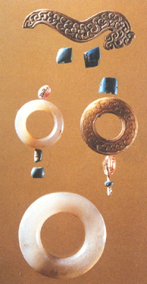 河南洛陽(yáng)中州路出土。戰(zhàn)國(guó)。由玉髓環(huán)二、玉環(huán)一、石夔龍一、綠松石五和紫晶珠三組成串飾,佩戴于墓主人的胸部。其組合方式是:最上一件較大的玉髓環(huán),器表光潔明亮,截面呈六棱形;中間分為兩行,一行是一顆鉆孔的小綠松石珠,兩顆鉆孔的小紫晶珠,下面是雕琢有勾云紋的玉璧,再下有兩顆鉆孔的綠松石與最下方的石夔龍背部小孔相連接;另一行是鉆孔的小綠松石和紫晶珠各一,其下是一件小玉髓環(huán),此環(huán)琢制規(guī)整,光潔明亮,截面呈七棱形,其下有一件鉆孔的紫晶珠和一件綠松石珠,下面連接石夔龍背的穿孔。夔龍回首,曲身,尾略向上卷翹,器表雕陰刻的輪廓線和虺紋。夔龍背上方鉆一孔,可與上述各種飾物串連成一套完整的組玉佩,而石夔龍垂于全佩下方!对(shī)、有女同車》云:“將翔將翔,佩玉瓊琚”,即是描寫這種佩飾之美。