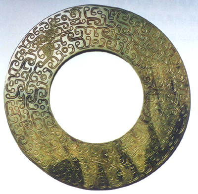河南光山黃君孟墓出土。春秋。青色。體扁平,圓環(huán)形,中心有一大圓孔。一面光素,一面以雙鉤飾細(xì)密變形并兼裝飾圖案的鳥紋。