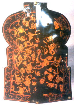 湖南長(zhǎng)沙五里牌出土。戰(zhàn)國(guó)中期。此盾近似葫蘆形,下邊兩角為方形,中間起棱。把手已失,但把手上的嵌銀銅鼻尚存。盾為皮胎,兩面均施黑漆。正面邊緣繪赭紅色云紋,中間用黃、紅色漆繪蟠曲龍紋。背面邊緣云紋為黃、紅色,中間為紅色蟠龍紋。這件漆盾制作極精,不似實(shí)用的防御武器。古代文獻(xiàn)中有關(guān)于“萬(wàn)舞”的記載,“萬(wàn)舞”即是模擬作戰(zhàn)的舞蹈。在這種舞蹈中,用盾、戚、戈為舞器。因此,這件漆盾可能是此類(lèi)舞蹈的舞器,也可能用作儀仗或其它裝飾品。頂部還陰刻“紫錦之衣”四字。