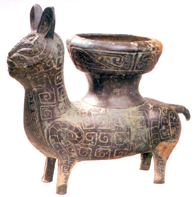 河南三門峽上村嶺出土。春秋早期。尊體作小牛形,耳上豎,無(wú)角。軀體飾云紋,面部及耳內(nèi)飾鱗紋,胸前飾斜角云紋,足上部有卷曲的云紋帶。牛背有外形似豆的尊口,口沿下環(huán)以斜角螭紋一周。器出自虢墓。西虢原封在今陜西寶雞,西虢覆滅后隨王東遷至此。此尊繼承西周動(dòng)物形尊傳統(tǒng),但造型已有所不同。