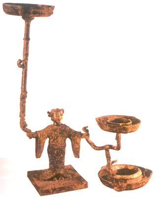 河北平山三汲出土。戰(zhàn)國中晚期。燈為長袍男子形。首系銀質(zhì),兩目嵌寶石。衣上花紋可見朱、黑兩色填漆。其右手握螭,螭口銜柱,柱頂為一燈盤。柱飾錯銀龍紋,繞以浮雕螭龍,并有一猴作攀援狀。左手持螭尾,螭身天橋橫出,口托另一燈盤。螭下方又有燈盤,有螭蟠臥其中,翹首攫噬。人形足下有獸紋方座。此燈所雕的男子,赤手搏持螭龍,當有一定神話背景,其面部表情愉悅恬靜,非常生動,發(fā)型也很工整細致。