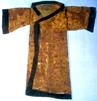 湖北江陵馬山出土。鳳鳥花卉紋繡淺黃絹面綿袍,兩袖平直,寬袖口,短袖筒,三角形領(lǐng)。上衣四片,其中正身兩片,兩袖各一片,上衣下部拼有一塊三角形面料;下裳九片。裁制時(shí)把整幅的繡面剪開,每片大致照顧到刺繡圖案的主題不被破壞。深黃色絹里。領(lǐng)緣多用緯線起花絳,外緣用田獵紋絳,內(nèi)緣中部和大襟上部內(nèi)側(cè)用龍鳳紋絳,內(nèi)緣兩側(cè)用鳳鳥菱形紋錦。袖和下擺緣均用大菱形紋錦。