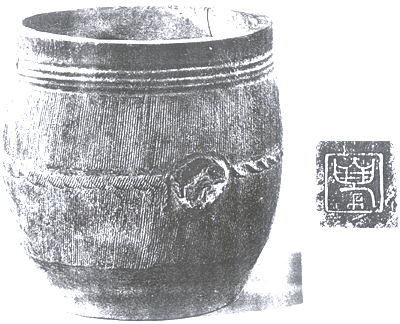 山東鄒縣紀(jì)王城出土。戰(zhàn)國。高33.2、口徑30、底徑23厘米,容20000毫升。廣口深腹。腹部有對稱的兩柄,內(nèi)底有印文“廩”字,當(dāng)是倉廩中使用的量器。鄒縣在戰(zhàn)國時曾先后屬鄒、魯、莒等國,故難以確定此器國別。鄒、魯、莒與齊國為近鄰,此器容量與齊國一釜相當(dāng)。