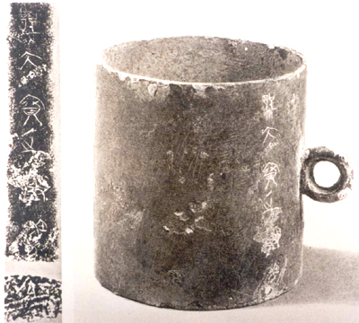 安徽鳳臺出土。戰(zhàn)國。高12.5、口徑11.6厘米,容1110毫升。廣口,直壁。有一環(huán)形柄。刻銘兩處,外壁:“郢大之口”,底部:“少”。郢為楚國都城之通稱!按”即“大府”。根據(jù)《周禮·天官·大府》的記載,“大府”是管理貢賦的機(jī)構(gòu)。“”當(dāng)讀為“”,《說文》:“陳謂飯帚曰,從竹捎聲。一曰飯器,容五升!逼髯糟,可能是五升量。折算每升合222毫升。
