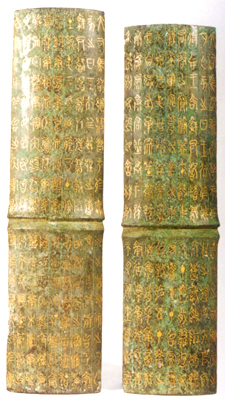 安徽壽縣丘家花園出土。戰(zhàn)國中晚期。節(jié)作竹節(jié)形,五件可合成圓筒。出土時共存舟節(jié)一件,車節(jié)三件。節(jié)面各有錯金文字九行,舟節(jié)共一百六十三字,車節(jié)共一百五十四字。古代的節(jié)有的剖竹為之,見《周禮·小行人》。此節(jié)作于楚大司馬昭陽敗魏軍于襄陵之年,即公元前三二三年。楚王命大工尹等為鄂君啓鑄節(jié),作為水陸交通的憑 證。銘文詳記交通路線,對研究當時的地理及交通情況十分重要。