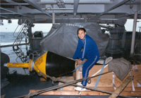 施放前,我和神沢騎在Buoy上,與 Buoy留影。據(jù)神澤說,這三個Buoy將在這些海區(qū)探測一年以上,每天向法國的一個衛(wèi)星發(fā)射六次資料,這是國際聯(lián)合觀測計劃中的一部分。