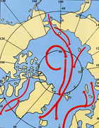 盡管北冰洋的大部分洋面被冰雪覆蓋,但冰下的海水也像全球其他大洋的海水一樣在永不停息地按照一定規(guī)律流動(dòng)著。如果說(shuō)潮汐是大海的脈搏,那么海水的環(huán)流就是大海的生命。在北冰洋表層環(huán)流中起主要作用的是兩支海流:一支是大西洋洋流的支流——西斯匹次卑爾根海流,這支高鹽度的暖流從格陵蘭以東進(jìn)入北冰洋,沿陸架邊緣作逆時(shí)針運(yùn)動(dòng);另一支是從楚科奇海進(jìn)來(lái),流經(jīng)北極點(diǎn)后又從格陵蘭海流出,并注入大西洋的越極洋流(東格陵蘭底層冷水流)。它們共同控制了北冰洋的海洋水文基本特征,如水團(tuán)分布,北冰洋與外海的水交換等。