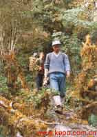 早晨9點許,從一號營地出發(fā),一直上山,翻過一個約3040米的山口。我們一直在原始森林中穿行,兩足基本上在樹根上移動,時而從一根大的樹干踏過,時而鉆過橫亙在前進道路上的一棵大樹下,有趣極了。森林下長著一片片厥類植物。上山難,難在攀登需要力氣,稍一加快,就要氣喘吁吁。上山難,下山更難。翻過3040米的小山后,一直下坡,路陡又窄,每個人都幾乎摔過跤。我雖然行走小心,但也摔了一跤,且正好碰在一塊石頭上。我的左腿在過去登山中受過傷,這一跤摔后,走路不便了,稍一著地用力,就隱隱作痛,只好盡量讓右腿多負擔點?偹銏猿值搅硕枲I地。