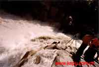 民族畫報社的高級記者凌風,長得又瘦又小,但攝影方面卻又精又巧。他對石咀上拍照不滿意,要求用繩捆上他下谷底。我征得丹增、加措同意后,丹增用那條60米長的登山繩按登山操作方式把凌風捆了個結(jié)實,再由丹增、加措、央金等5人依次抓緊登山繩,由丹增操作,慢慢把凌風往下放,大約放下10米,在一處可站的巖石上,凌風盡情拍照著,我用長焦鏡頭在岸上拍下凌風下巖的工作照。拍完后,凌風要求再下,丹增認為不能再下了,為了安全,只好把凌風拉了上來。徐進等也想下,丹增、加措認為不保險,沒有如愿。