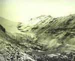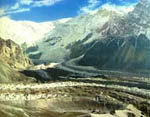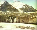 冰川表面的巖石碎塊稱為表磧,冰川內(nèi)部的叫內(nèi)磧,冰川底部的叫底磧,冰川兩側(cè)的是側(cè)磧。側(cè)磧靠近山坡,碎石巖塊的來源豐富,因而側(cè)磧又高又大,象左右二道夾峙著冰川的巍巍城墻。到冰舌前端,二條側(cè)磧大多交匯在一起,連成環(huán)形的終磧。終磧象高大的城堡,拱衛(wèi)著冰川,攀登冰川的人,必須首先登臨終磧,才能接近冰川。我國西部不少終磧高達二百余米。并不是所有冰川都有終磧的,前進迅速和后退迅速的冰川都沒有終磧,只有冰川在一個地方長期停頓時,才能造成高大的終磧。兩條冰川匯合時,相鄰的兩條側(cè)磧合為一條中磧。樹枝狀山谷冰川表面中磧很多,整個冰川呈現(xiàn)黑白相間的條帶狀。