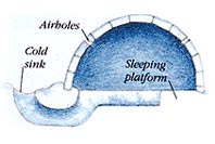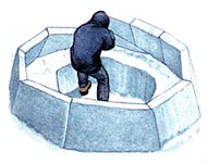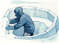 建造雪屋,除了長刀一把,不需要任何工具。最適合于建筑雪屋的積雪,是那些經(jīng)過暴風(fēng)雪吹打而變得很密實的雪。用切西瓜那樣的長刀,把積雪切成一塊一塊較大的雪磚,使雪磚互相挨緊,磚縫之間抹上一層碎雪作為灰漿。