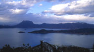 古詩云:“瀘沽秋水闊,隱隱浸芙蓉。并峙波問鼎,連排海上峰。倒涵天一碧,橫鎖樹千重。應(yīng)識仙源近,乘槎訪赤松”。