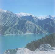 在新疆,經(jīng)緯度N43°53ˊ,E88°08ˊ的地方,烏魯木齊以東的東天山高聳的博格達(dá)山上,靜靜的躺著一個(gè)當(dāng)?shù)厝藗儯ú刈遄灾沃,阜康縣)俗稱的“大海子”。那是神話傳說中王母娘娘入浴之池,古稱“瑤池”。又說是王母娘娘梳妝臺上的一面鏡子,清乾隆年間取“天鏡”、“神池”之意,命其為“天池”。為了同東北長白山天池區(qū)別,俗稱“天山天池”或“阜康天池”。