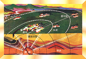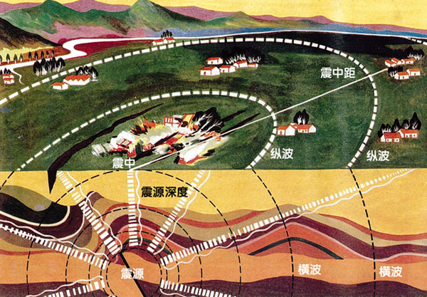 由于縱波在地球內(nèi)部傳播速度大于橫波,所以地震時(shí),縱波總是先到達(dá)地表,而橫波總落后一步。這樣,發(fā)生較大的近震時(shí),一般人們先感到上下顛簸,過(guò)數(shù)秒到十幾秒后才感到有很強(qiáng)的水平晃動(dòng)。這一點(diǎn)非常重要,因?yàn)榭v波給我們一個(gè)警告,告訴我們?cè)斐山ㄖ锲茐牡臋M波馬上要到了,快點(diǎn)作出防備。