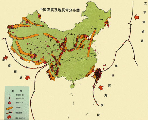 中國位于世界兩大地震帶—環(huán)太平洋地震帶與歐亞地震帶之間,受太平洋板塊、印度板塊和菲律賓海板塊的擠壓,地震斷裂帶十分發(fā)育。本世紀以來,中國共發(fā)生6級以上地震近800次,遍布除貴州、浙江兩省和香港特別行政區(qū)以外所有的省、自治區(qū)、直轄市。