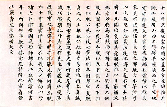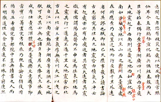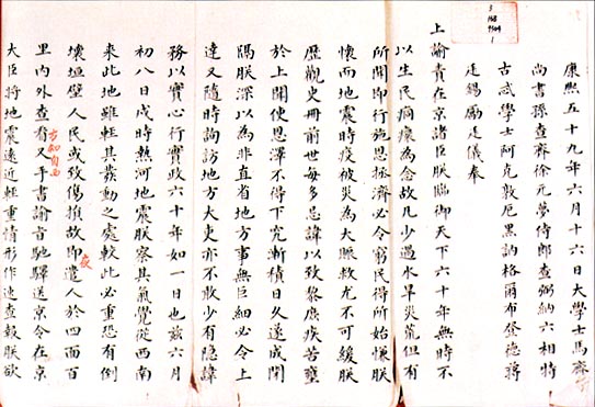 ……據(jù)天文科該直博士費(fèi)揚(yáng)古等呈報(bào):本年六月初七日壬寅巳時(shí),候得地微動(dòng)一次,從西南坤方來。