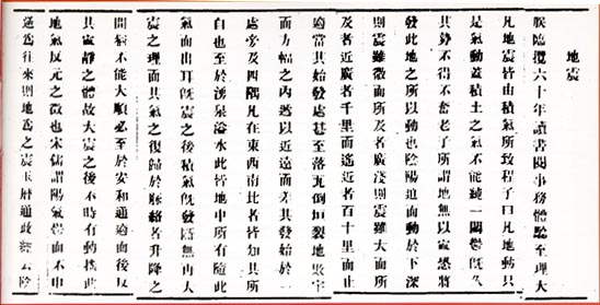 康熙繼承王位后,華北地區(qū)地震不斷,康熙一面下詔賬恤災(zāi)民,一面對地震成因進(jìn)行研究。1721年,67歲高齡的康熙皇帝在他病逝前一年,結(jié)合自己在數(shù)次大震中的感受和體會,撰寫了論文《地震》,《地震》著于康熙60年,刊于雍正10年編錄的《御制文》第4集第30卷內(nèi)。
