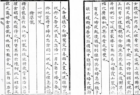 有邑人婦,夜起溲溺,回視則狼銜其子,婦急與狼爭(zhēng)。狼一緩頰,婦奪兒出,攜抱中。狼蹲不去,婦大號(hào),鄰人奔集,狼乃去。婦驚定作喜,指天畫地,述狼銜兒狀,已奪兒狀。良久,忽悟一身未著寸縷,乃奔。