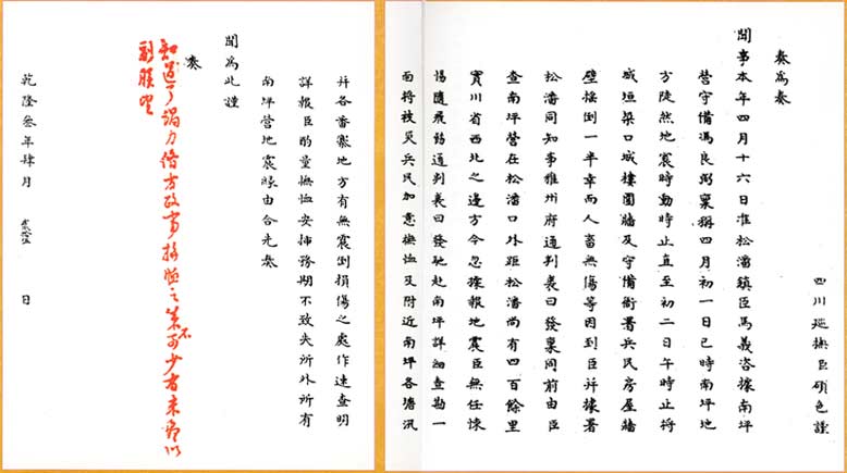 朱批碩色四川南坪地震奏折 清乾隆三年(1738年)四月二十五日 朱批碩色四川南坪地震奏折 乾隆三年四月初一四川南坪營發(fā)生5 1/2級地震,城墻震裂十余處,城樓歪斜損壞,搖倒垛口三百八十一堵;會龍堡城垛搖到二百四十五堵;山石滾落,死、傷行路者各一人。