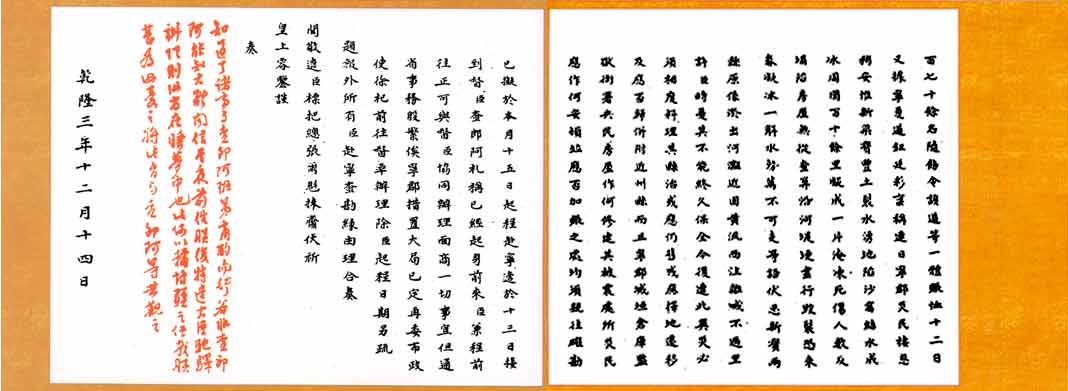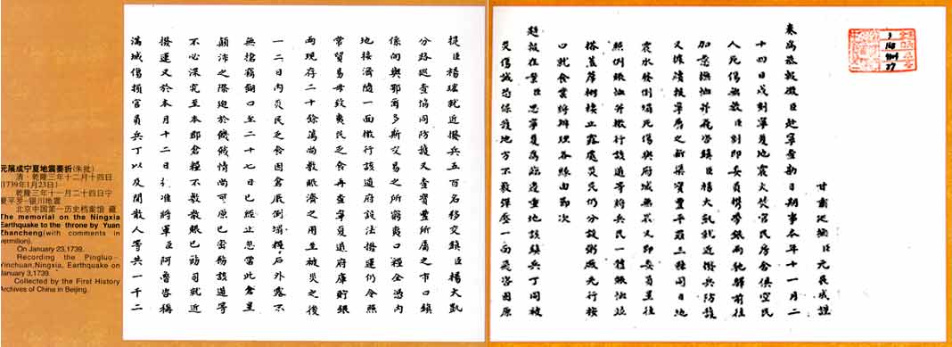 朱批元展成寧夏地震奏折 清乾隆三年十二月十四日(1739年1月23日) 乾隆三年十一月二十四日甘肅寧夏府、平羅一帶發(fā)生8級地震,寧城及平羅、新渠、寶豐三縣廟宇、衙署、民房倒塌無存,壓死三萬八千余人。寧夏府城,滿城盡毀,屋倒火起,五晝夜煙焰方熄,軍民被傷壓死者十之四、五。 朱批元展成寧夏地震奏折