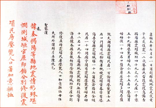 光緒二十一年七月十一日酉刻廣東揭陽6級地震,塌城垣四十九丈六尺,瓦屋一千零五十九間,壓斃五十五人,傷十四人。鹽倉房屋震塌多間,存鹽毀失。潮陽塌民房一百余間,衙署概被震塌,壓斃五人,亦有傷者。普寧塌城垛十七個,監(jiān)、倉墻垣全傾,倒民房十四間,廟宇間有震塌,壓斃十二人。澄海倒房百余棟,壓斃約四十人。沙汕頭當?shù)厝说呢敭a(chǎn)受到相當損失,外國洋樓墻和天花板裂縫。