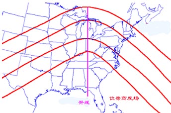 (3)低壓槽(簡(jiǎn)稱槽)。是低壓向外伸出的狹長(zhǎng)部分,或一組未閉合的等壓線向氣壓較高的方突出的部分。在槽中,各等壓線彎曲最大處的連線叫槽線。氣壓沿槽線最低,向兩邊遞增。槽的尖端,可以指向各個(gè)方向,但在北半球中緯度地區(qū)大多指向南方。因此,尖端指向北的稱為倒槽,指向東西的稱為橫槽,槽附近的空間等壓面類似山谷。