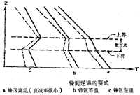 鋒附近風(fēng)場(chǎng):風(fēng)在鋒面兩側(cè)有明顯的逆向轉(zhuǎn)變,即由鋒后到鋒前,風(fēng)向呈逆時(shí)針方向變化。