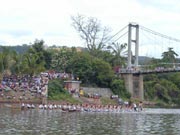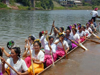 在傣族傳統(tǒng)新年潑水節(jié)(陽歷的四月中旬)的文娛活動(dòng)中,其中有一天是安排劃舟比賽。到了那一天,河岸兩邊總有擁擠的人群,尤其是穿著節(jié)日盛裝、花紅柳綠的少女們,手中擎著五彩的遮陽傘,觀看河中各村社的健兒們劃著獨(dú)木舟競(jìng)賽。河中百舸爭流,河岸上則“水!水!水!”(加油)之聲不絕,一片緊張、熱鬧和歡騰的景象。在漢族地區(qū),人們?cè)诙宋绻?jié)也要舉行劃龍舟比賽,那是為了紀(jì)念古代的愛國詩人屈原而舉行的活動(dòng)。那么,傣族地區(qū)在新年舉行劃船活動(dòng)是具有什么文化背景呢?雖無從考證,但也許可以推測(cè),這與傣族的崇龍有關(guān)。傣族的崇龍已有悠久的歷史,它既受了“九隆神話”的哀牢彝族文化的影響,又受了中原龍文化的熏染。如在傣族的歷史長詩《召樹屯》中,王子因得龍助而得到喃吾諾娜;既使至今,龍的雕塑總是守護(hù)在佛寺庭院或大門的兩旁。在傳說中,龍總是出現(xiàn)在云雨之中,能騰云潛淵,主水旱而牽動(dòng)著農(nóng)耕民族的悲歡。傣族依水而居,早就擅長稻作,加之熱帶雨林多蛇蝎,故傣族崇龍之習(xí)便應(yīng)運(yùn)而生。傣族新年過后,他們將投入繁忙的農(nóng)耕。劃船比賽,一些船的前面還斜豎有木刻的龍頭,有的船身還畫有龍鱗,因而這一活動(dòng)也許包含了傣族的先民們祈求主宰水旱的龍神為他們帶來一個(gè)風(fēng)調(diào)雨順之年。