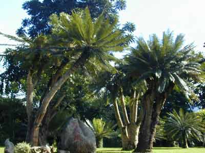 植物園內(nèi)有三株巨大的鐵樹,一雄兩雌,于上個(gè)世紀(jì)80年代末從野外引種而來,是云南省迄今為止發(fā)現(xiàn)的最古老的鐵樹,樹齡近千年,被廣大中外游人譽(yù)為“鐵樹王”,堪稱稀世之寶。它們的學(xué)名叫篦齒蘇鐵Cycas.pectinata Griff,目前,這種植物已瀕臨滅絕,被國家定為二級保護(hù)植物。