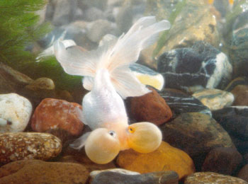 鴛鴦水泡是以眼部的色彩變異而命名。正常眼為黑色。此類品種魚體白色,而眼球卻呈紅色,或藍色,或一紅一藍。