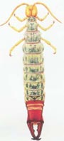 觸角念珠狀,內(nèi)藏的咀嚼式口器;沒有復(fù)眼和單眼色。體長2-20毫米,我國西藏有一種鋏尾蟲,體長竟達(dá)49毫米,為世界所罕見。體白色或黃色。前胸小,中、后胸相似。跗節(jié)1節(jié),有2-3爪。腹部11節(jié),前7節(jié)有成對(duì)的刺突和泡囊。尾須發(fā)達(dá),其中尾須線狀的種類叫雙尾蟲;尾須骨化成鉗狀的種類叫鋏尾蟲(仿陳瑞瑾圖)。本目有時(shí)被提升為雙尾綱。