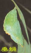 垂蛹 蝶類的蛹大多沒有特殊的保護(hù)物,常以尾端鉤著在幼蟲作成的一小塊絲墊上,頭部朝下地倒掛著,這種蛹稱垂蛹或掛蛹。蝶蛹還常以這樣的光裸蛹越冬,它們具有極強(qiáng)的抗寒能力,大多數(shù)蝶蛹有同它背景相似的保護(hù)色。 帶蛹 另一些蝶以尾端鉤著在幼蟲作成的一小塊絲墊上,頭部向上以一根細(xì)絲圍縛蛹體,維系在物體,這種蛹稱帶蛹或縊蛹。
